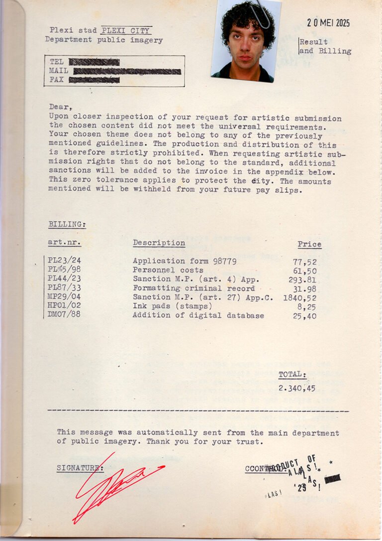 Selected for the 2025 Onboard Biennale, The Application responds to the theme of Relationships by reflecting on the quiet parallels between artistic and everyday encounters with bureaucracy. Centered around a fictional document, the work blends surrealism with the familiar cadence of administrative language, issuing a denial laced with fabricated sanctions and obscure regulatory warnings.